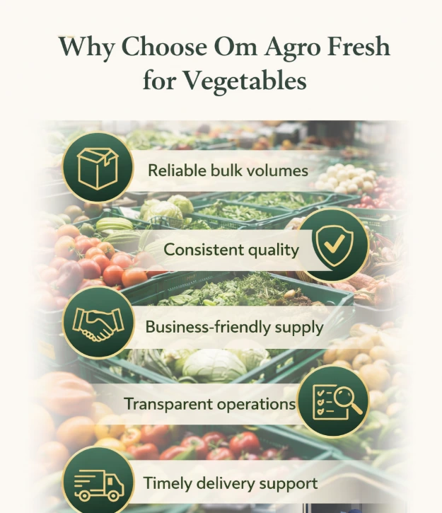 At Om Agro Fresh, we specialize in delivering farm-fresh vegetables with uncompromised quality, consistency, and reliability. Our vegetables are sourced directly from trusted farms and producers, ensuring freshness from origin to delivery. Every batch undergoes systematic sorting, grading, and quality checks before hygienic packaging, so our clients receive only the best produce every time. With a strong B2B-focused supply chain, we understand the importance of timely dispatch, bulk handling, and consistent standards. Whether you are a hotel, restaurant, retailer, distributor, or corporate buyer, Om Agro Fresh ensures dependable vegetable supply that supports your business operations smoothly and efficiently.