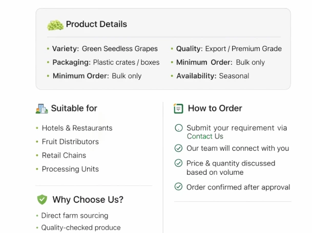 Fresh, high-quality grapes with natural sweetness and long shelf life, ideal for bulk supply and commercial buyers.